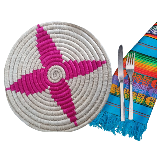 Con este juego de individuales de diseño natural, hechos a mano con paja y cabuya, agrega un toque de elegancia y estilo a tus comidas. Su diseño redondo añade un toque contemporáneo a tu mesa, mientras que sus colores complementan una amplia variedad de decoraciones. También personalizamos tus ideas. Son 6 unidades de 25 cm de diámetro.