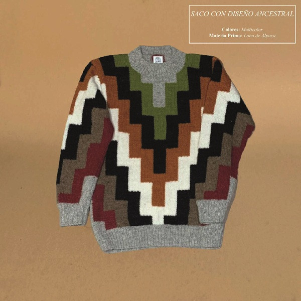 Elegante sueter para hombre, tejido a mano con lana fina de alpaca por las artesanas de Salinas. Su diseño representa los caminos ancestrales de las comunidades indígenas que en quichua se conocen como chaquiñanes.